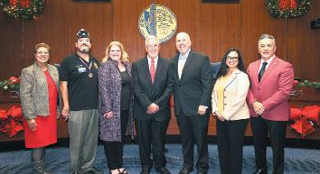 NEW LEADERSHIP: from (l-r) Councilmember Ana Valencia, Post Commander Angelo Maldenado of the American Legion Post 359 led the flag salute, Mayor Jennifer Perez, Outgoing Mayor Tony Ayala, Former Norwalk Mayor Leonard Shryock led the invocation, Vice Mayor Margarita Rios, and Councilmember Rick Ramirez.