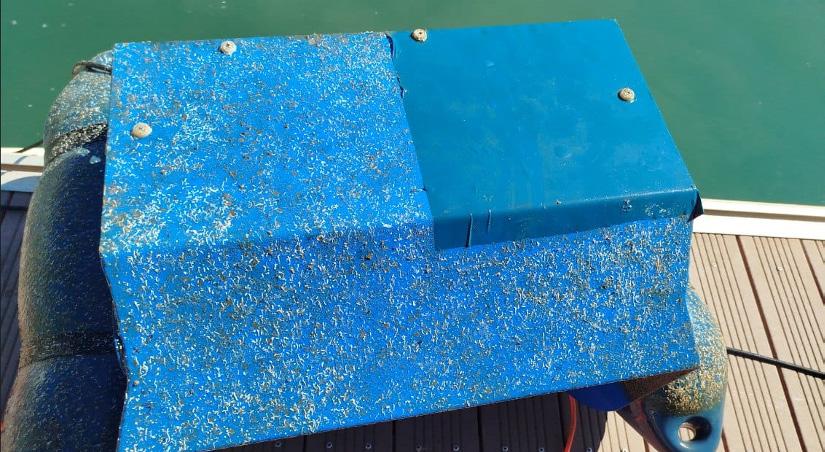 Film adhesivo con tecnología antifouling, desarrollado para combatir la proliferación de organismos marinos: consiste en un PVC fundido multicapa, impermeable y con acabado azul satinado.
