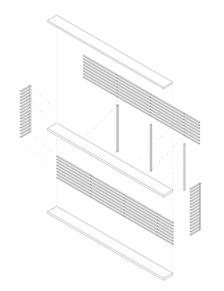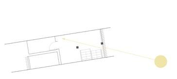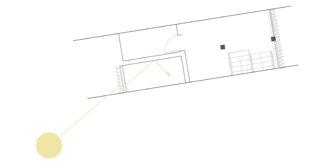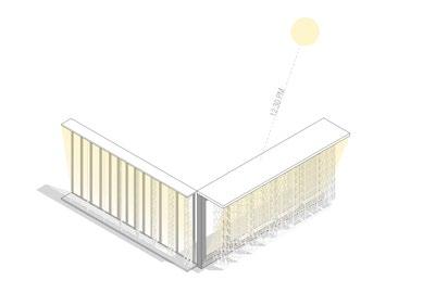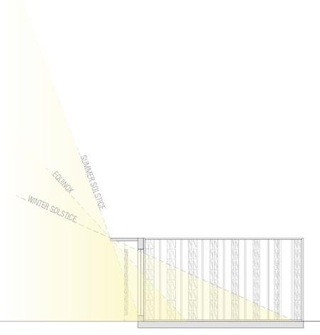 The shading device accounts for the different sun angles throughout the calender year. In the section above, the sun angles show how the horizontal panel and vertical louvers sahde the interior space from the sun effectively during the winter solstice, autumn and spring equniox, and summer solstice.