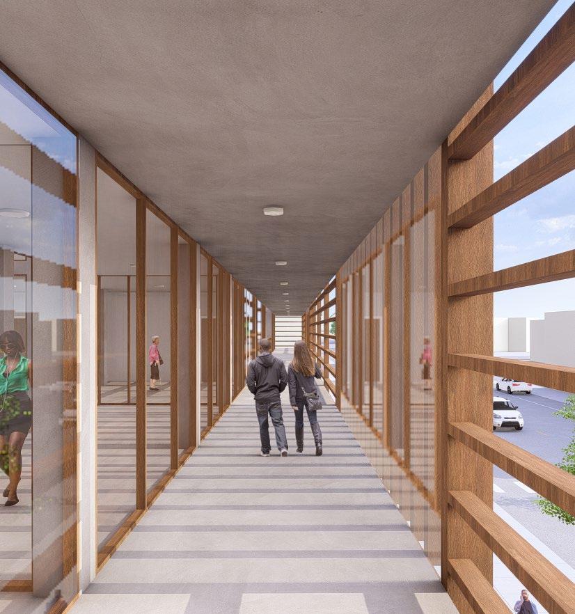 The brise soleil is blended into the building facade as both a protective exterior layer and a shading device. The outdoor walkways provide additional circulation that fosters a seamless connection to nature, inviting users to user exterior means of circulation during the warmer months. The design connects users to nature while still being within the building and provides protection from the busy street in a more controlled environmental space, enhancing the overall spatial quality and user engagement.