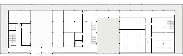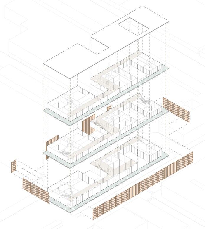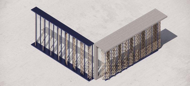 This shading device is comprised of two main components: rotating, vertical louvers and horizontal panels. Adapting to varying sun angles, the vertical louvers exhibit unparalleled flexibility. Each vertical louver panel is affixed with a central rod that acts as an axis of rotation, facilitating a complete 365-degree pivot. This mechanism allows for adjustment throughout the day, ensuring optimal sunlight diffusion and heat management. The horizontal panel is made out of concrete and extend out one meter from the facade, shading the interior from high sun angles. The shading device demonstrates a nuaunced understanding of the sun’s dynamics while enhancing the overall architectural aesthetics.