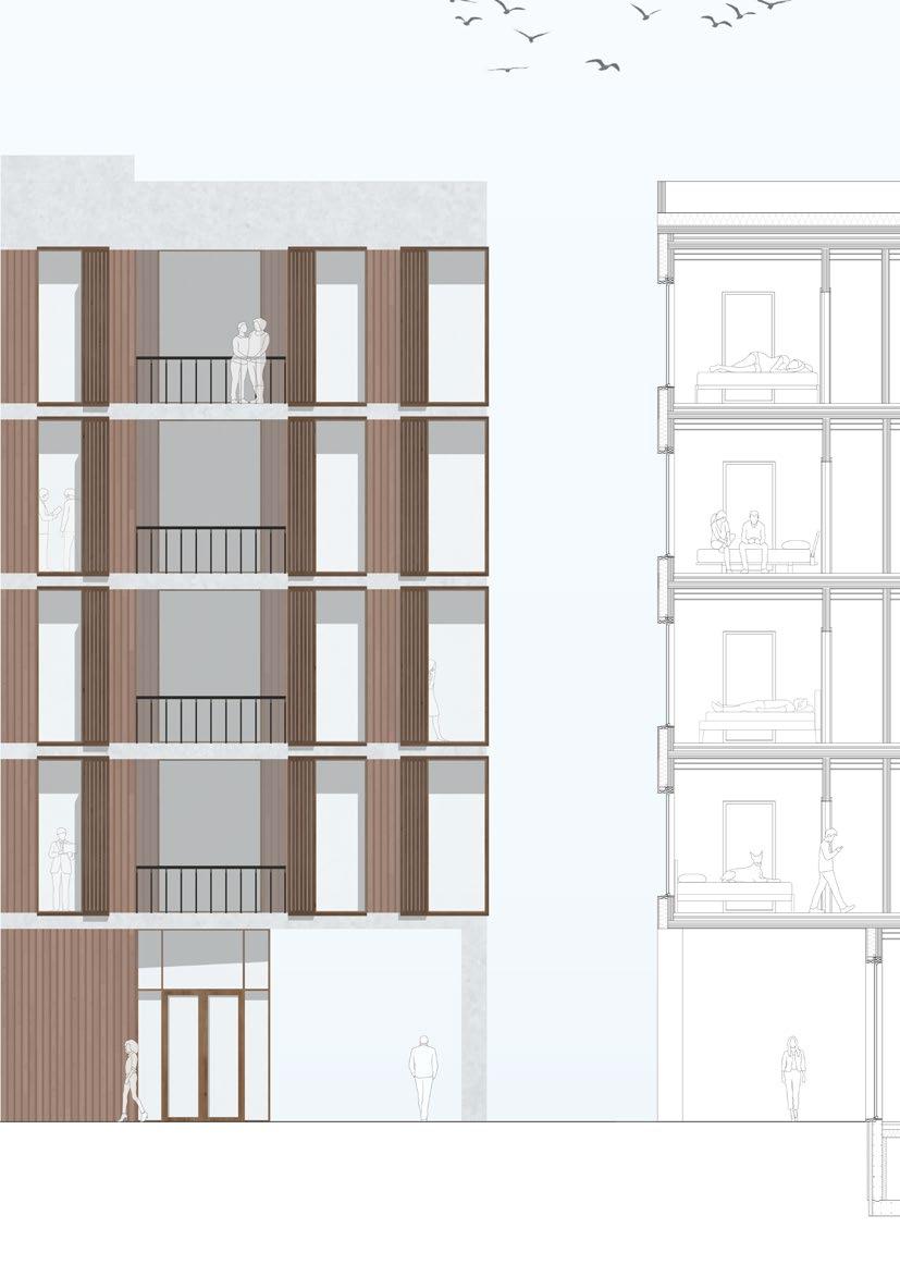 Vista Apartments constitue a residential complex comprising three residential buildings nestled within Barcelons’as vibrant Poblenou neighborhood. Positioned merely two blocks west from the shoreline, this apartment complex responds to the surrounding urban fabric with an open ground floor plan scheme that creates a central courtyard that connects and aligns with the neighboring city blocks.