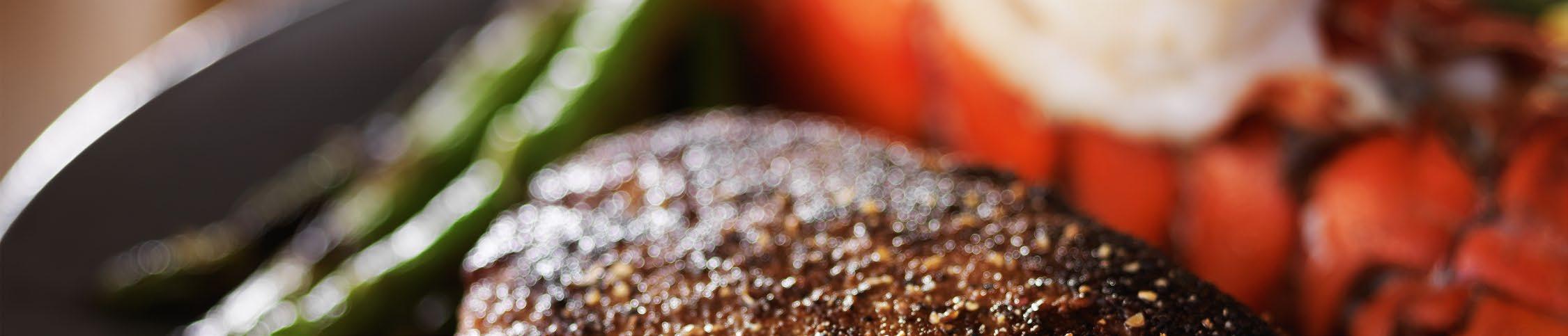 Char-grilled filet mignon with butter and chardonnay-roasted Maine lobster tail, served with potato purée, duet sauce and vegetable bouquet