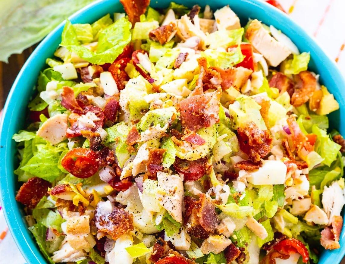 Bed of romaine and baby mixed greens, herb-grilled chicken breast, vine-ripe tomatoes, chopped eggs, applewood-smoked bacon, bleu cheese crumbles and diced avocado