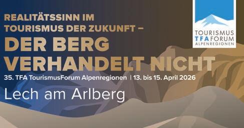 InteressierteHGV-Mitgliedererhaltenunterder AngabedesRabattcodes „TFA26-P4-N5R“günstigere Konditionen. WeitereInformationen unddenLinkfürdieAnmeldungzumTFA– TourismusForumAlpenregionen gibtesauf derentsprechenden Website. www.tourismusforum.ch
