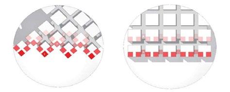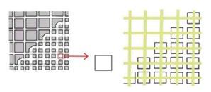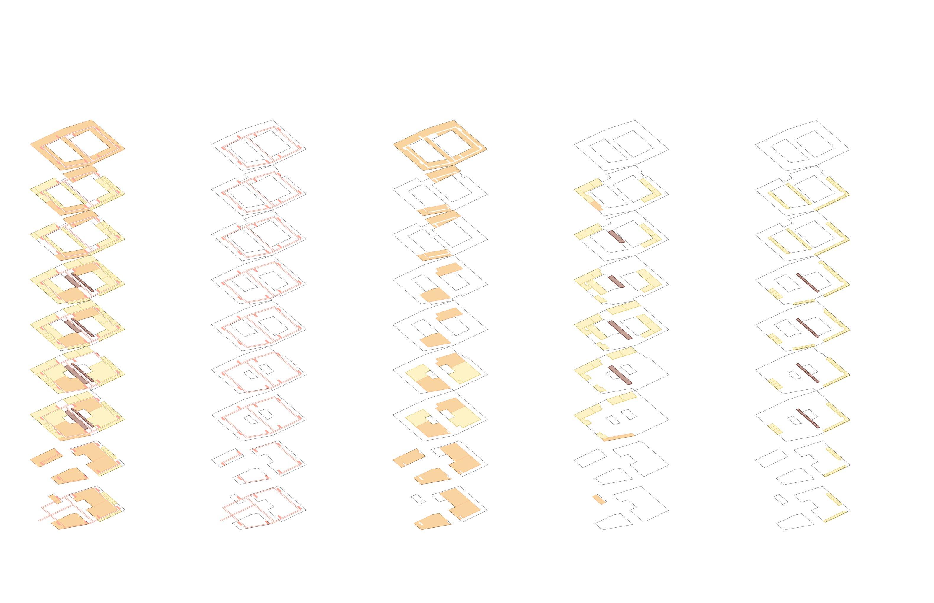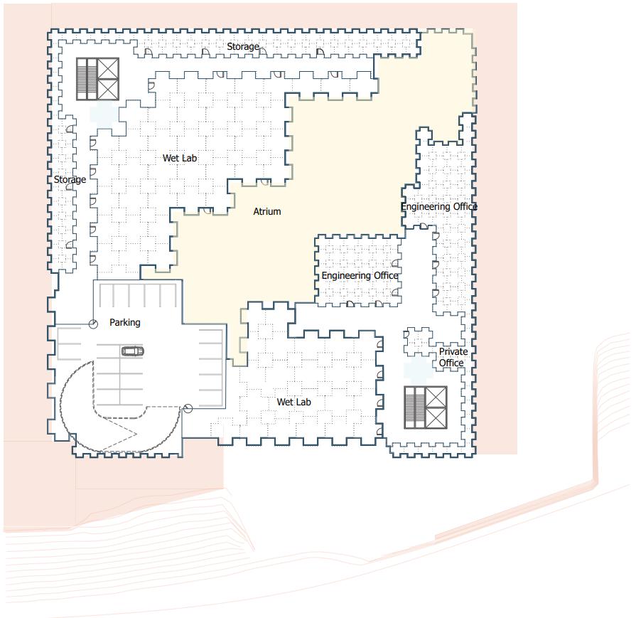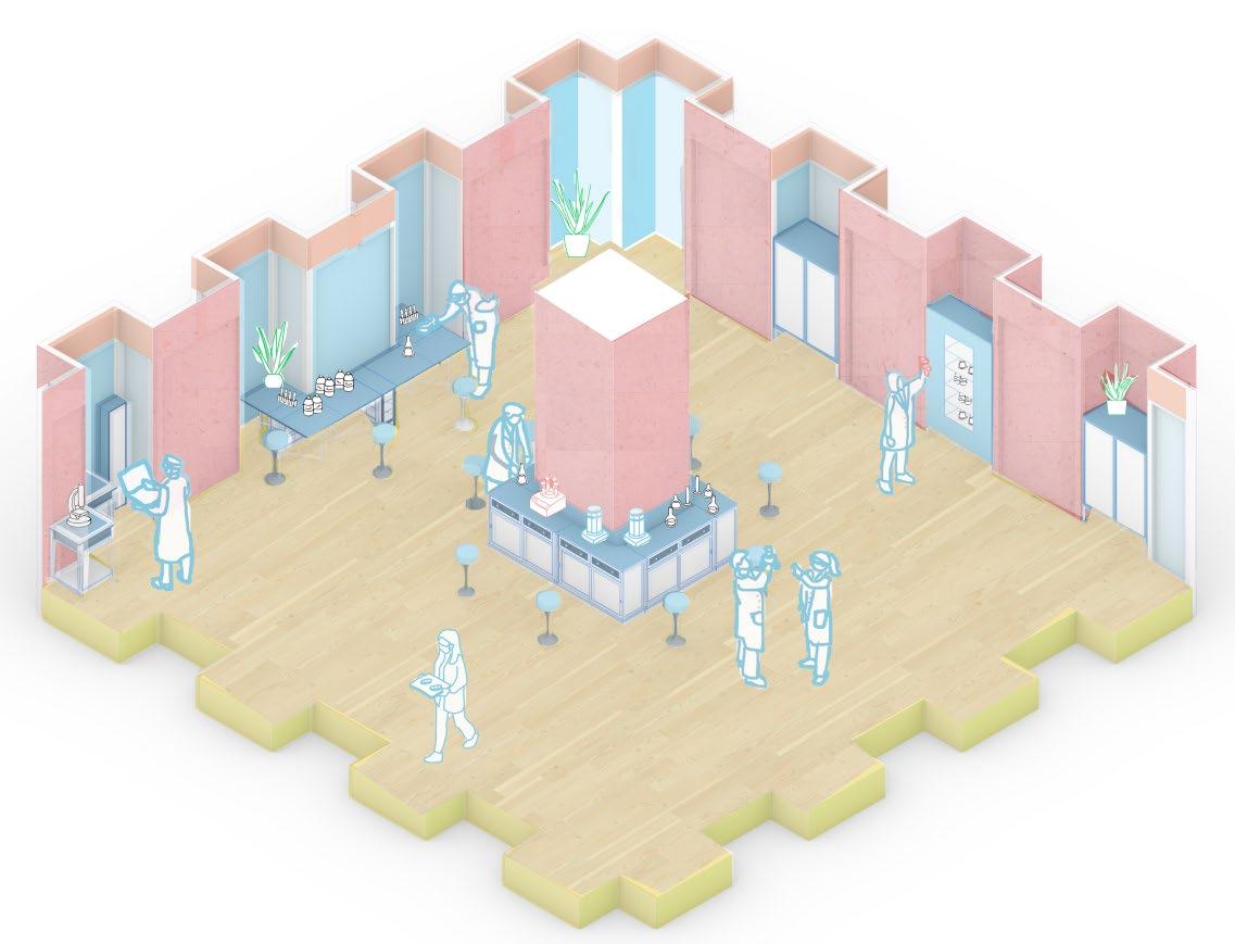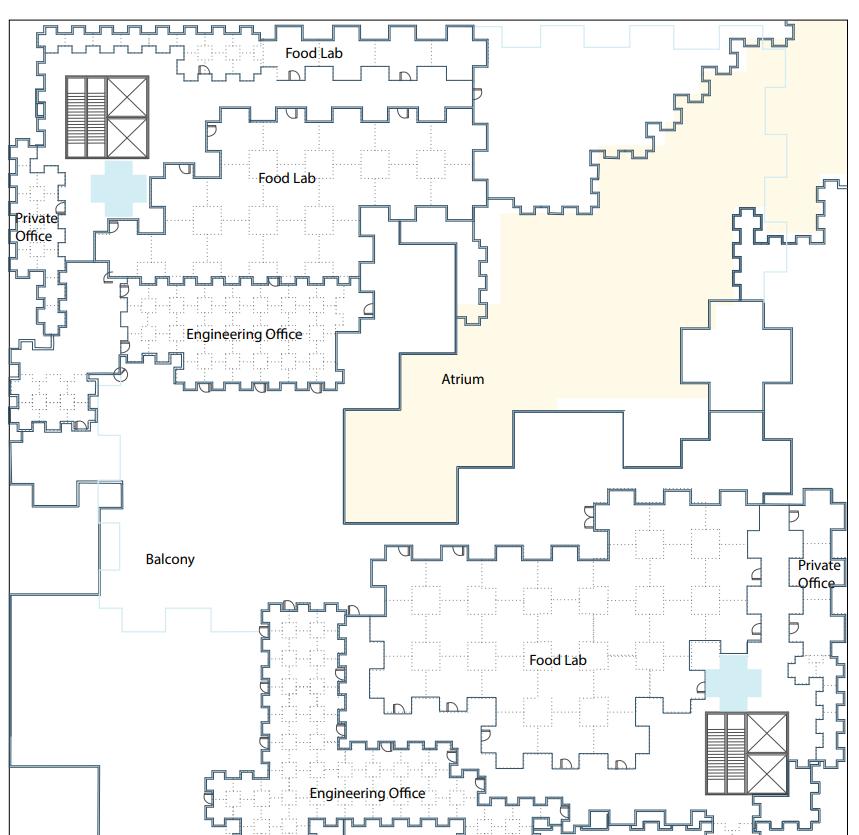 Modular and fractal ideas are being used to enable the building to build efficiently. Modular spaces are also created to be used either as offices, labs, or recreational public spaces.