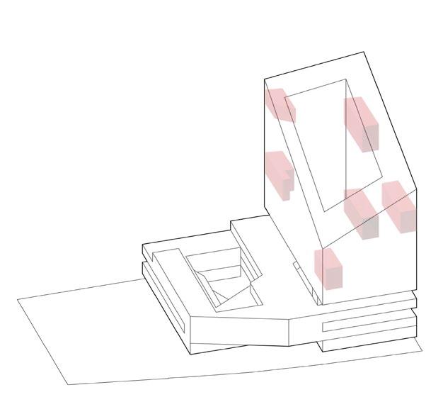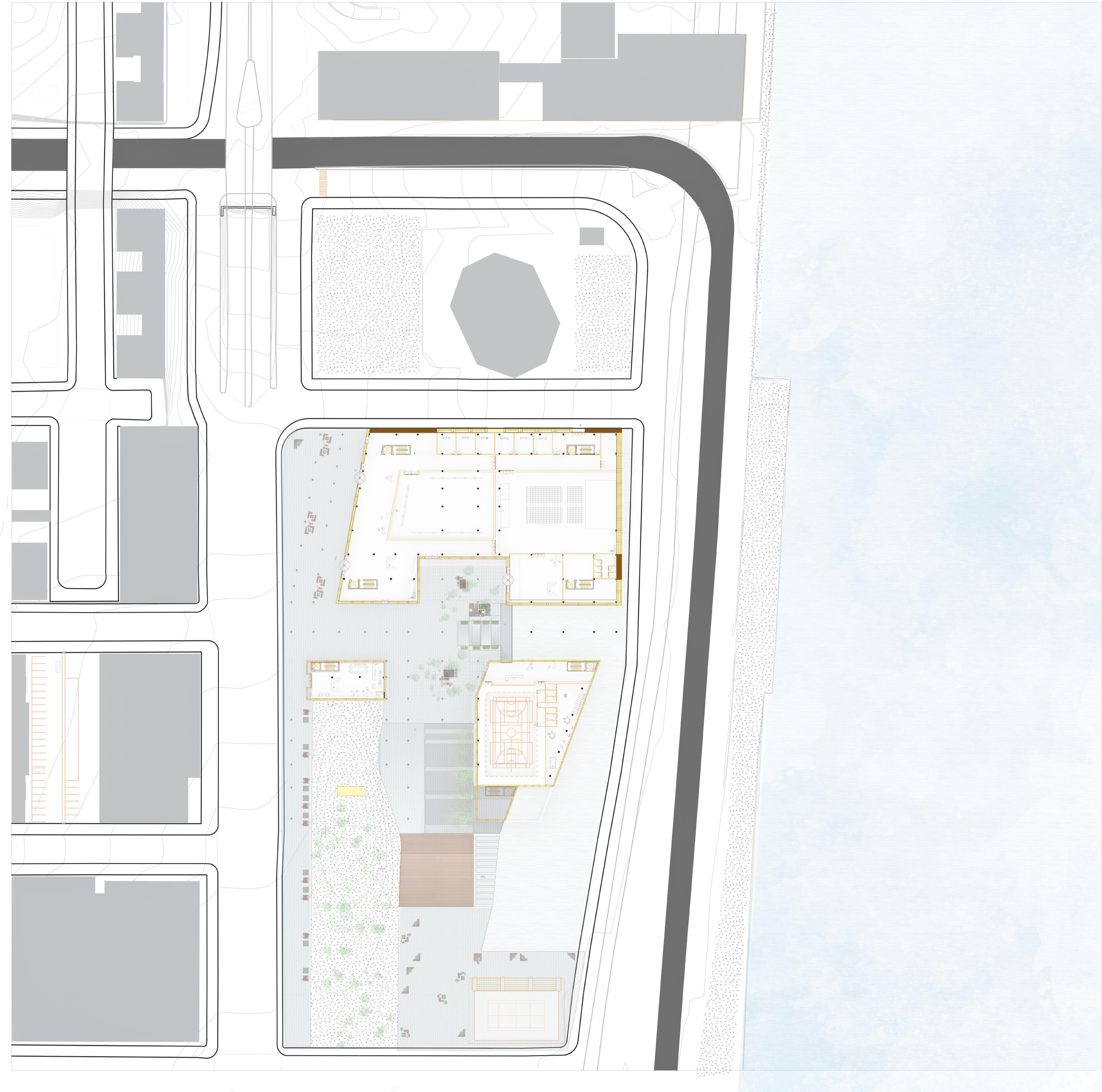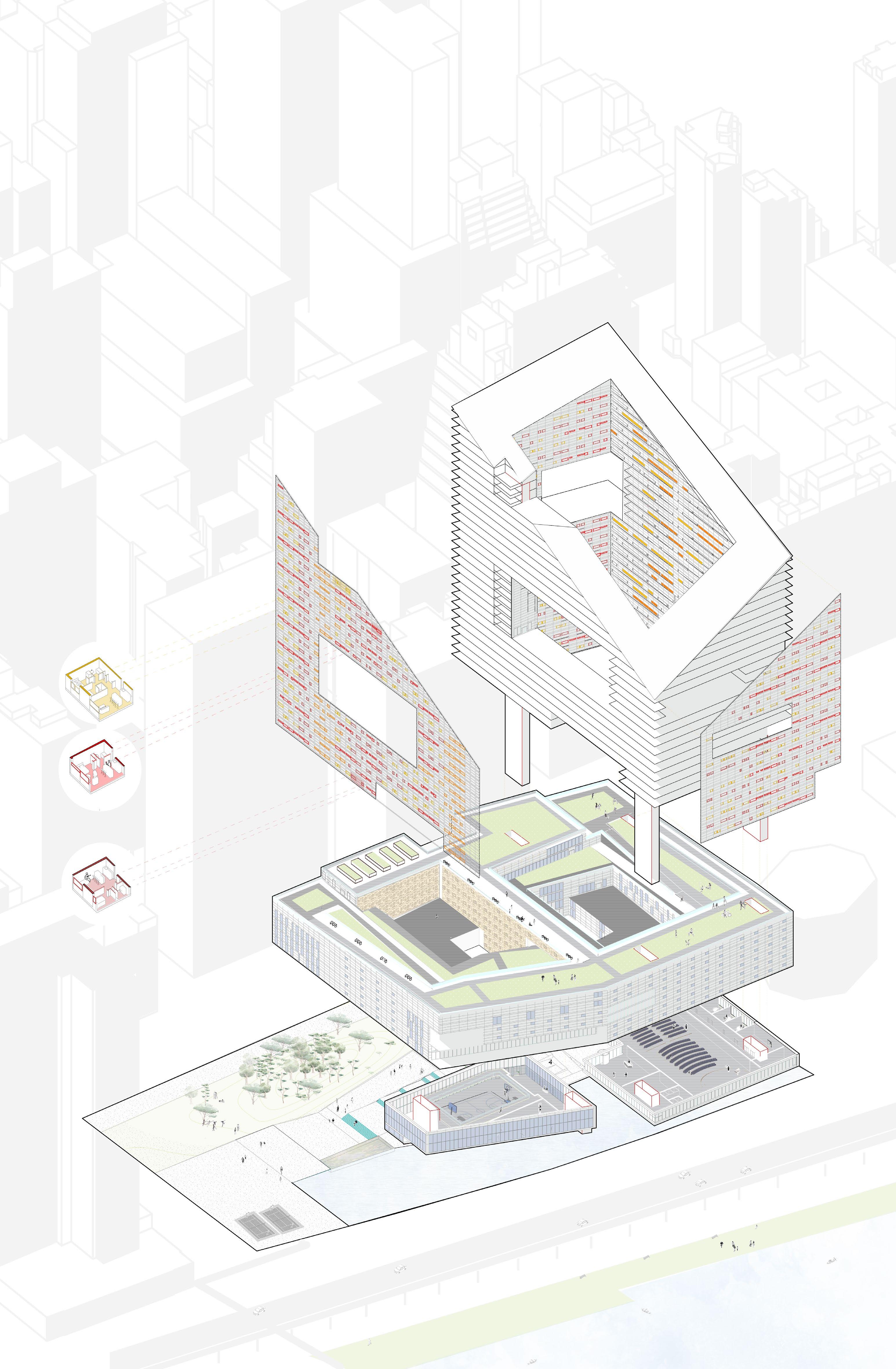 The timber inserted with window to give a best view for the the tilting rythmn of the wood in different areas of the building. The mounted timber transit from lower down to the ground to the higher up to the water, letting different space volume define the functions of the builiding. The density of the timber creates the privacy space for different parts of the building in needs.