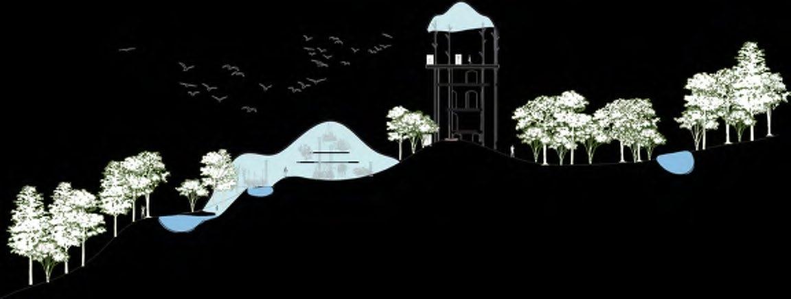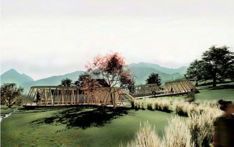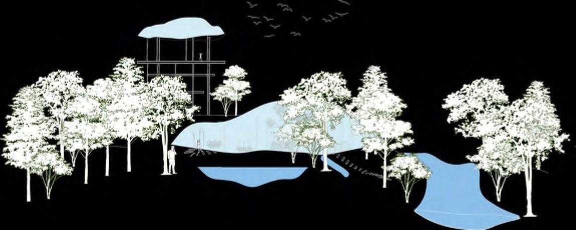The landscape is being reformed and led by the water flow that leads visitors to go through both pond, glasshouse, and the bird observation tower. While experiencing the hierarchical differences, people can also explore different micro-climate shaped by the transformed landscape features.