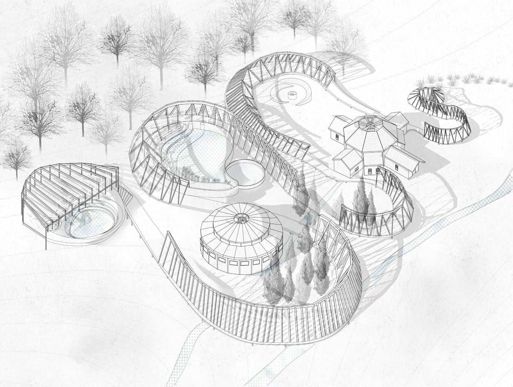 This is project is nspired by the flowing shape of the river in the nature. It experiment with timber’s shape to interact with human’s spaces and the location of the pools in between. Flowing Height was a place welcoming people from those who are recovering from diseases, travelers of the trails around, to any people who would like to be cured by the nature in the beautiful blue ridge mountains.