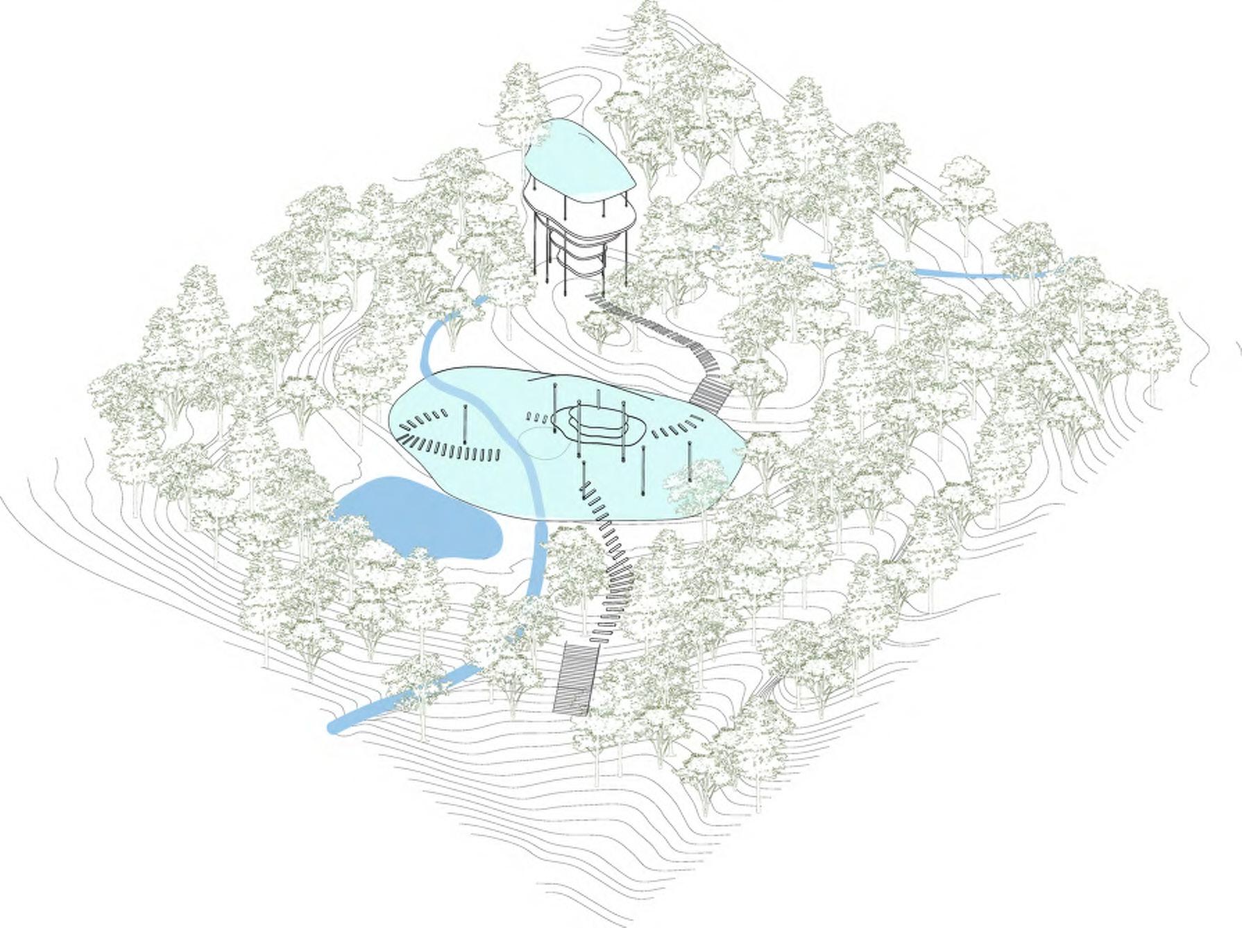 The landscape is being reformed and led by the water flow that leads visitors to go through both pond, glasshouse, and the bird observation tower. While experiencing the hierarchical differences, people can also explore different micro-climate shaped by the transformed landscape features.