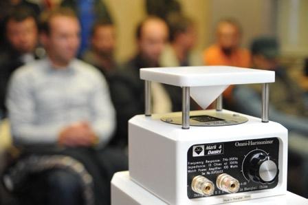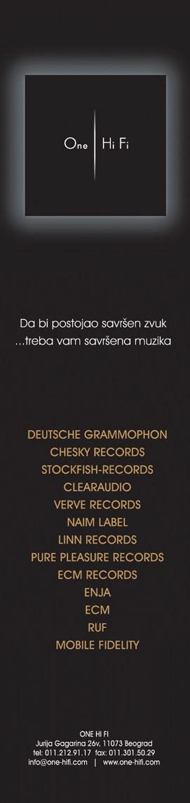 uglavnom bio nepoznat. Britanci su veoma zastupljeni na audio-tržištu, a Naim je svakako nešto posebno u gomili proizvoda koji dolaze sa Ostrva. Uticaj Naima na hi-fi istoriju je nešto što ovoj kompaniji obezbeđuje neosporni ugled i opšte poštovanje. U drugoj sali One HiFija mogli su se čuti Naim CDX2 i Supernait sistem. Prava britanska škola zvuka, sa veoma neutralnim, takoreći monitorskim kutijama Harbeth M30. Atmosfera u ovoj prosečno posećenoj sobi bila je mirna, staložena, sa zvukom koji vas ili odmah "kupuje" ili vas ostavlja ravnodušnima. Naša profesionalna radoznalost nas je zagolicala, pa smo poželeli da u ovu sobu preselimo već pomenuti ProAc Response D80-R... Nažalost, to ipak ostaje za neki drugi šou. Ovde su se mogli čuti audiofilski snimci, i to sa kvalitetnih ECM izdanja, a mogli ste da poslušate čak i vaše diskove, ukoliko ste ih poneli sa sobom. Pozdravljamo ovaj gest i nadamo se da će ubuduće i ostali distributeri, shodno mogućnostima, prihvatiti ovu praksu.