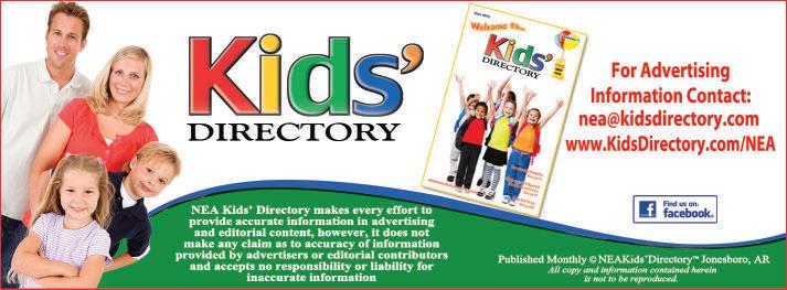 Our goal each month is to help inform our readers of the many opportunities, events, products and services available for families in Northeast Arkansas. Please remember to support the businesses that advertise in this publication each month and tell them that you saw their ad in NEA Kids’ Directory. If you are interested in advertising in NEA Kids’ Directory please call us at 931-0012.