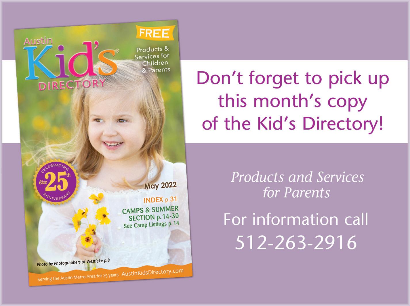 TO ADVERTISE IN THE AUSTIN KID’S DIRECTORY CALL 512-263-2916