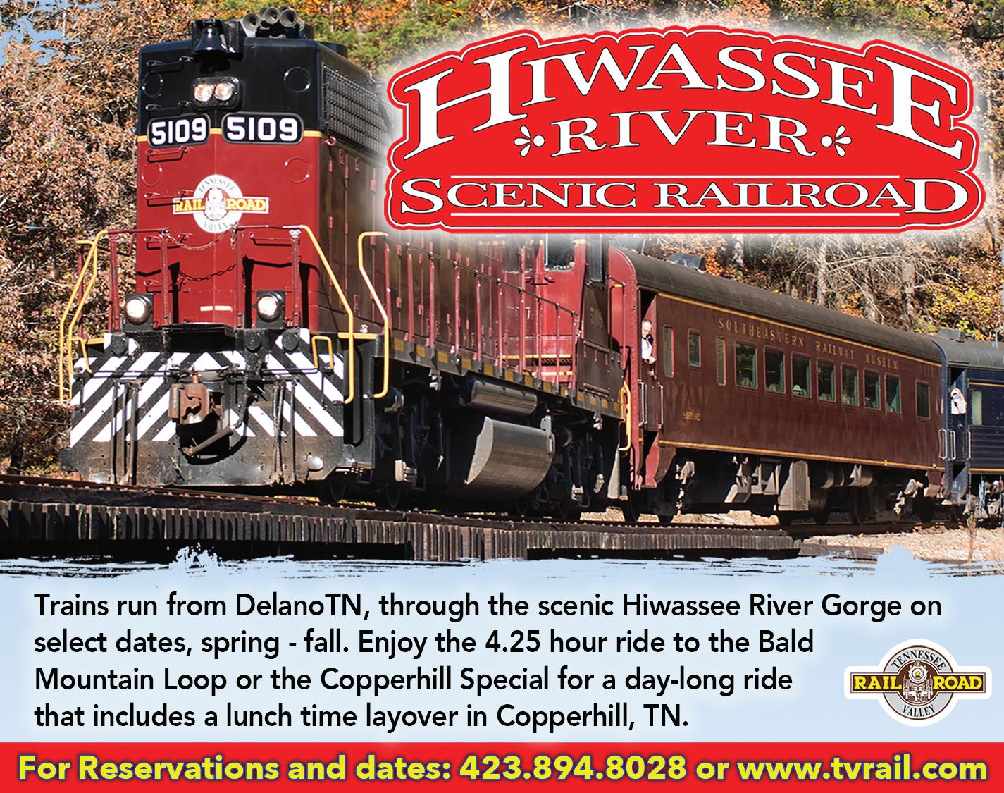 Trains run from Delano, TN, through the scenic Hiwassee River Gorge on select dates, spring - fall. Enjoy the ride to the Bald Mountain Loop or the Copperhill Special for a day-long ride that includes a lunch time layover in Copperhill, TN.