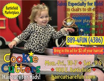 Bair’s All-American Sports Grill, four locations: 105 W. Sherman Way, Nixa, 417-725-3777; 3821 S. Campbell Ave., 417-368-5919, and 631 S. Kimbrough Ave., 417-866-2700, in Springfield; 1644 E. Hwy 60, Republic, 417-732-5077. All day, kids eat for $2.99 with the purchase of a regularpriced entrée.