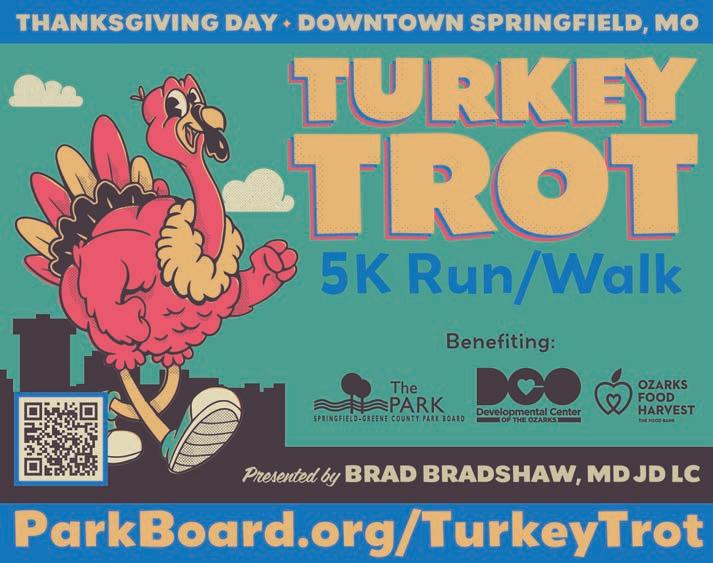 28th Annual Turkey Trot 5K Run/Walk. Four race categories: Elite, Runner, Walker, and Family/Pet. Benefits the Springfield-Greene County Park Board Youth Recreation Scholarship Fund and Developmental Center of the Ozarks. Register by Nov. 18 for discounted fee ($25/adult, $20/child). After Nov. 18 including race day: $35/adult, $30/child. parkboard.org/TurkeyTrot See ad on page 12