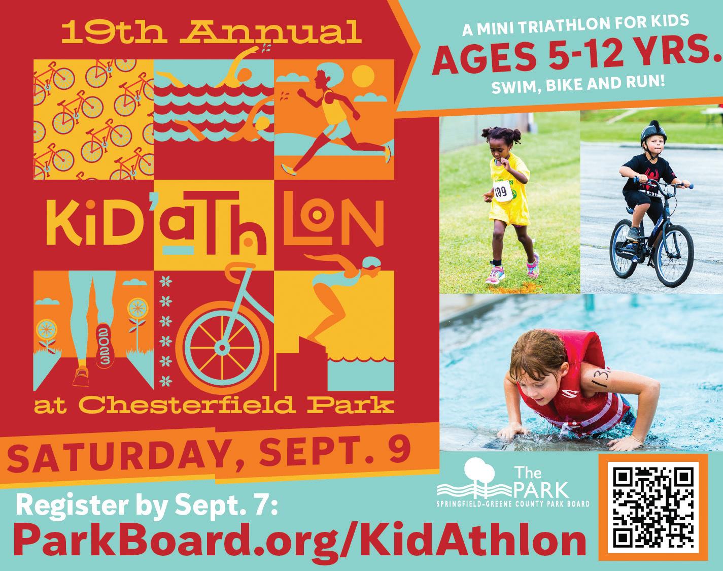 Kid’Athlon triathlon hosted by SpringfieldGreene County Parks. 8-9 a.m. for ages 5-8; 9:30 a.m.-12:30 p.m. for ages 9-12. Swim, bike, and run. Register by Sept. 7. $35/child and $25/additional child in the same household. Chesterfield Family Center, 2511 W. Republic Rd., Springfield 417-891-1616 or parkboard.org/kidathlon