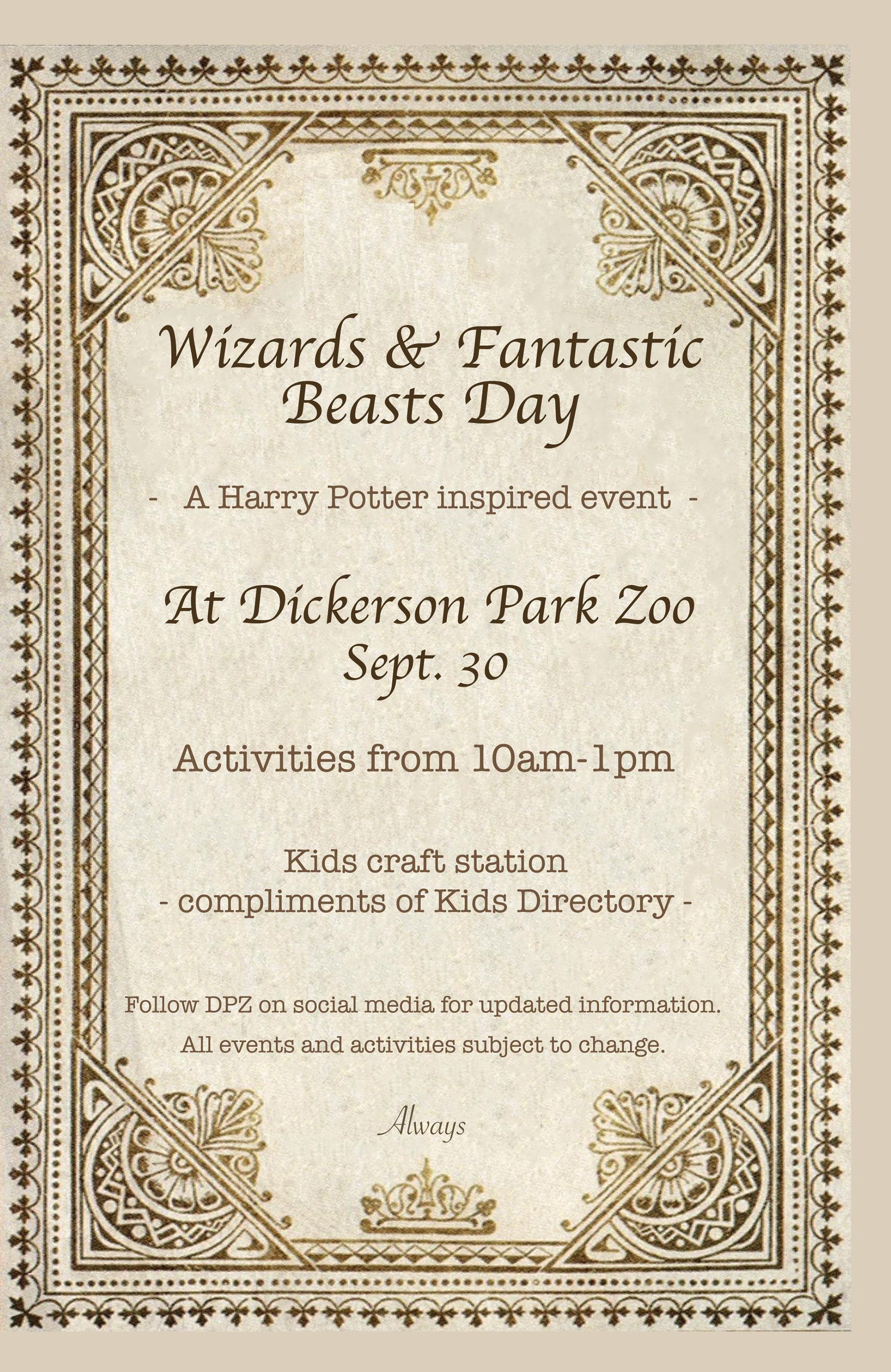 Wizards and Fantastic Beasts Day at Dickerson Park Zoo, 10 a.m.-1 p.m. A Harry Potter-inspired event for all ages. Zoo hours are 9 a.m.-5 p.m. Dickerson Park Zoo, 1401 W. Norton Rd., Springfield 417-833-1570 or dickersonparkzoo.org