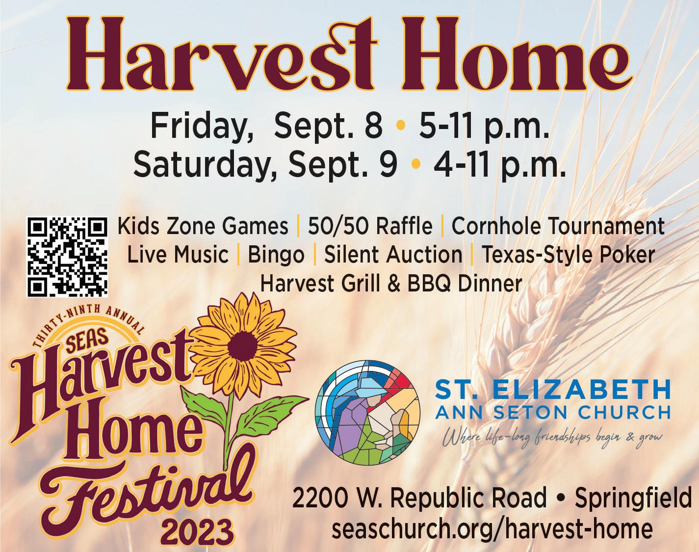 Harvest Home at St. Elizabeth Ann Seton Church. Kids Zone, live music, silent auction, Bingo, BBQ dinner and Harvest Grill. Corn hole tournament on Saturday (register online). Friday, 5-11 p.m.; Saturday, 4-11 p.m. St. Elizabeth Ann Seton Church, 2200 W. Republic Rd., Springfield 417-887-6472 x603 or seaschurch.org See ad on page 19.