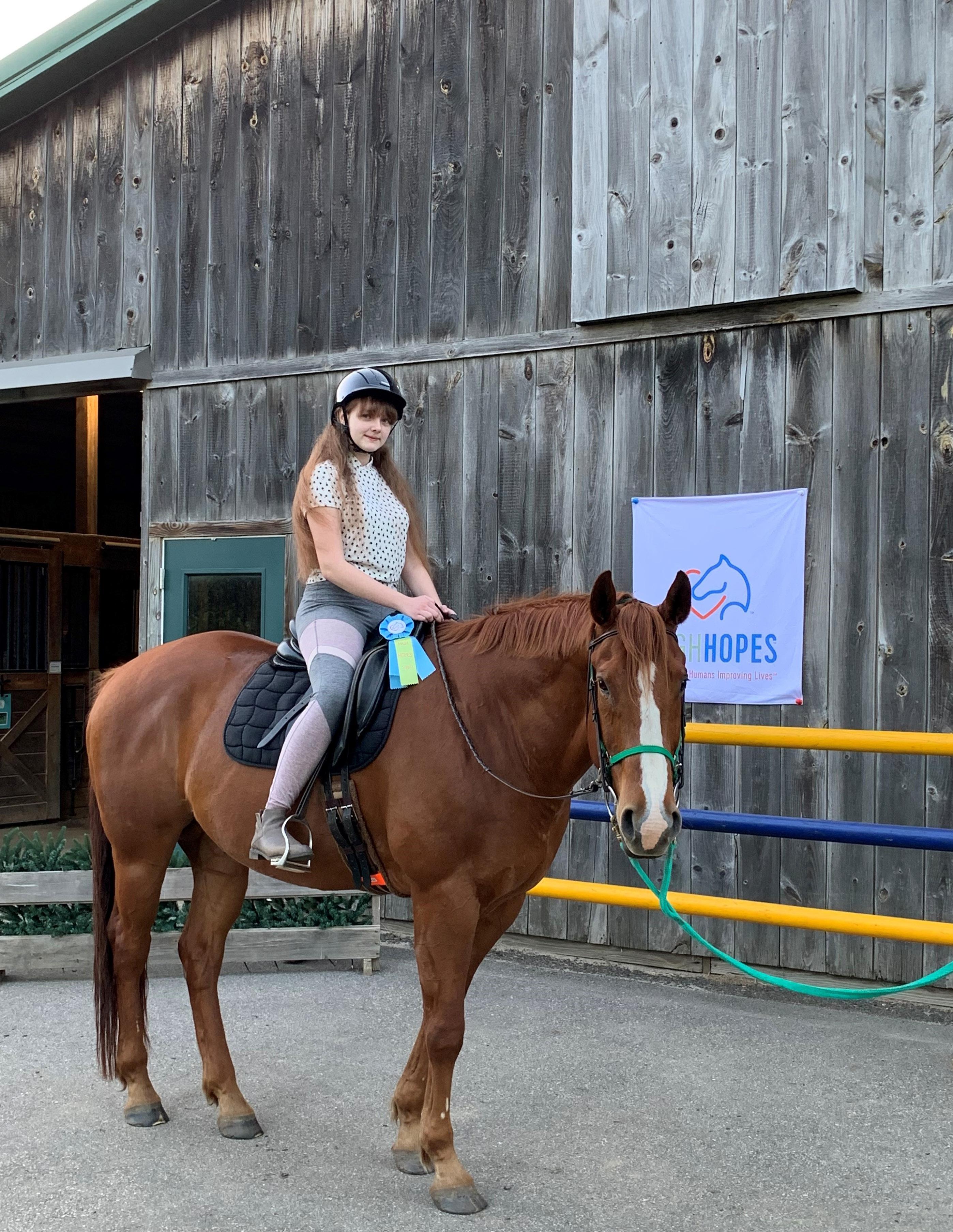 Sophia Shaposhnikova: (at left) From the first time she sat in a saddle at High Hopes in the Summer of 2021 until now, Sophia has embodied what it means to be an equestrian. The communication between Sophia and her horse, Joe, is subtle and gentle but extremely effective. Sophia’s ability to read and empathize with her horse has created a special bond between the two of them. Watching Sophia from one week to the next, one thing is clear: she improves with every ride. It is a pleasure to watch Sophia’s progress and we look forward to the good things to come!