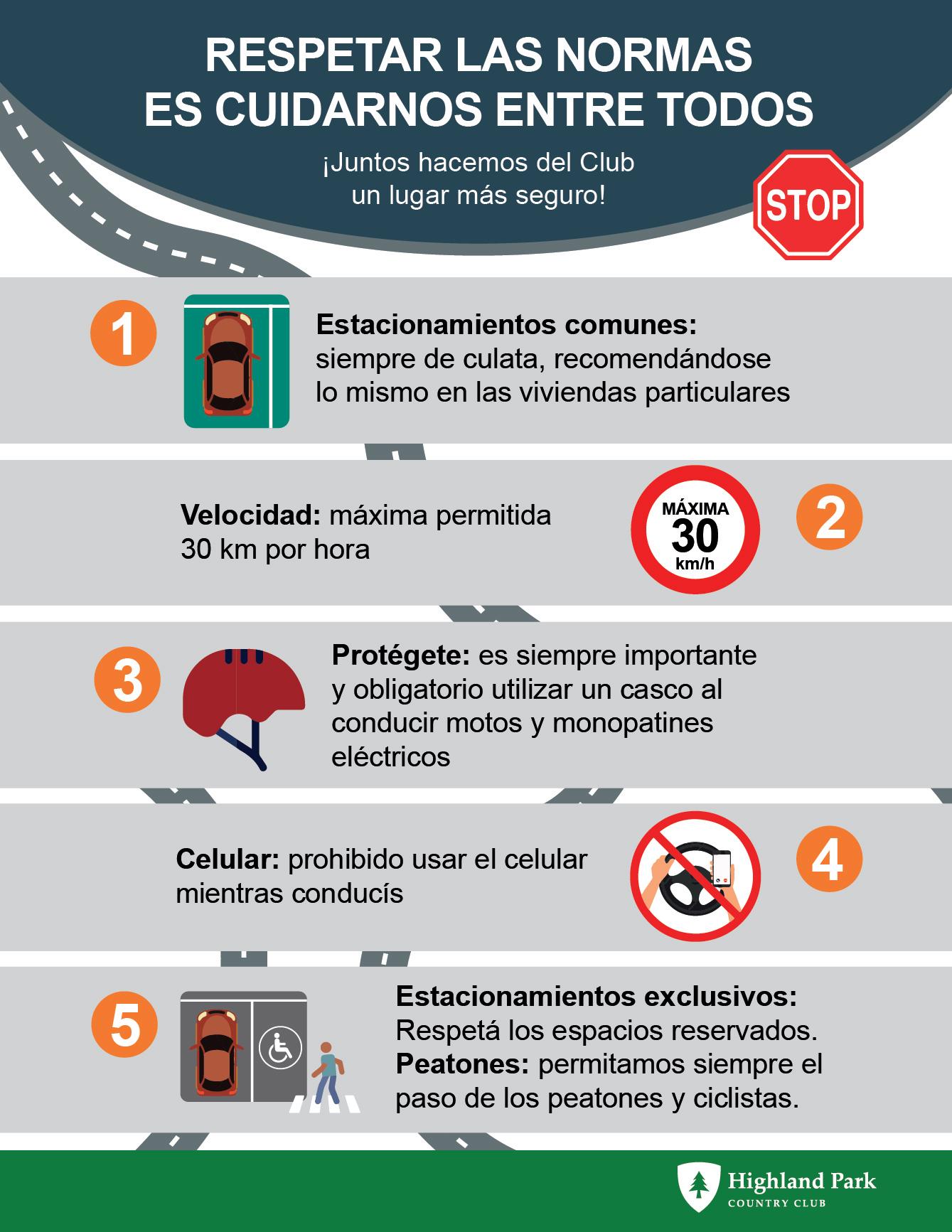 Cada día en nuestro Club circulan cientos de vehículos de todo tipo: camiones, camionetas,automóviles,carrosdegolf,bicicletas,monopatinesyhastamonoruedas. Resulta indispensable, como lo establece nuestro Reglamento de Tránsito, que todos estosvehículoscuentenconlucesoelementosrefractantessinexcepción. Debemos evitar incidentes y accidentes. Por ello, solicitamos revisen sus vehículos, los de sus familiares e invitados, ya que no se les permitirá transitar si los vehículos están fuera de norma. Tengan en cuenta que un simple “ojo de gato refractario” es de muy bajo costo y ayudará a evitar un accidente. Agradecemos la colaboración de todos para hacer nuestrascallesmásseguras.