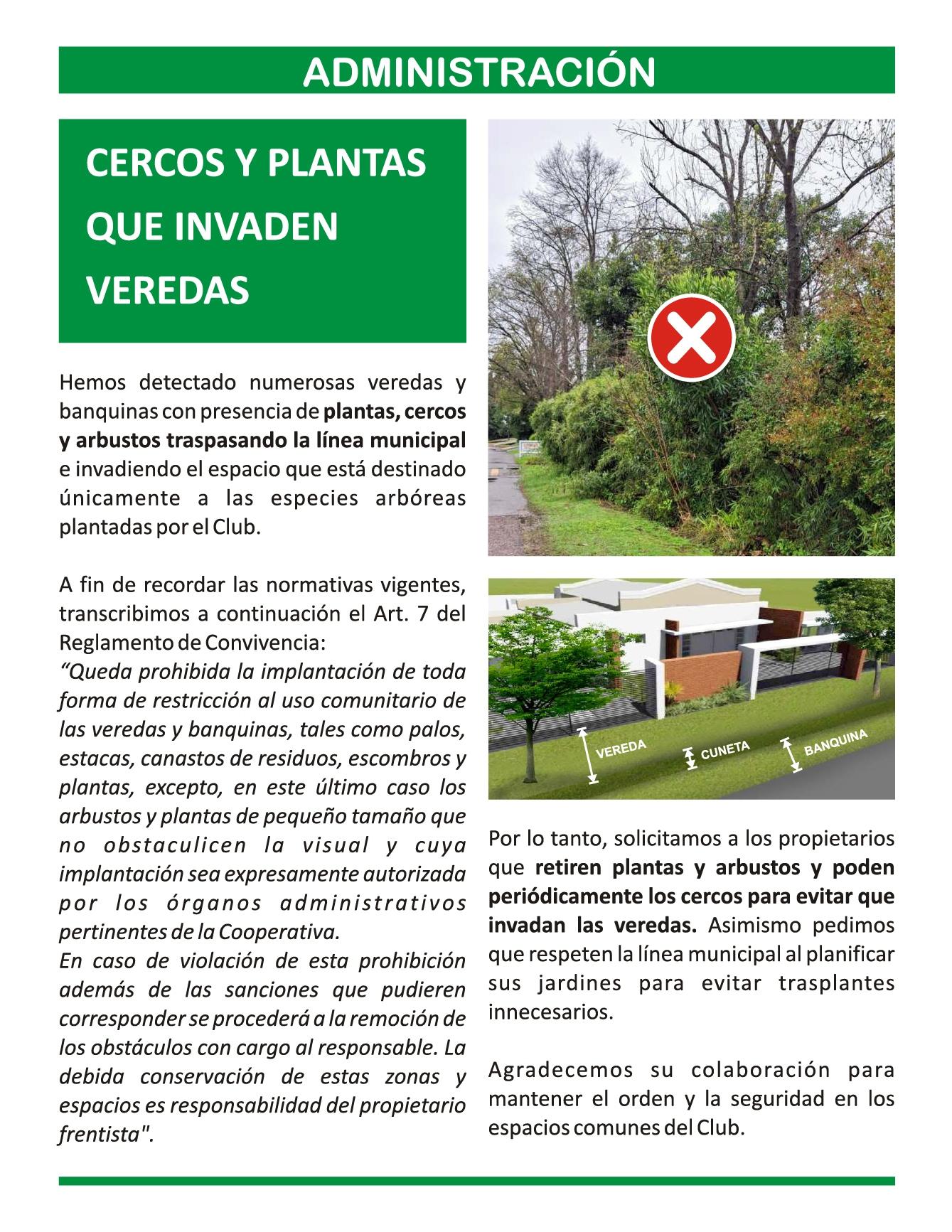 Recordamoselart.7delReglamentodeConvivencia,transcriptoacontinuación: "Queda prohibida la implantación de toda forma de restricción al uso comunitario de las veredas y banquinas, tales como palos, estacas, canastos de residuos, escombros y plantas, excepto, en este último caso los arbustos y plantas de pequeño tamaño que no obstaculicen la visual y cuya implantación sea expresamente autorizada por los órganos administrativos pertinentes de la Cooperativa. En caso de violación de esta prohibición además de las sanciones que pudieren corresponder se procederá a la remoción de los obstáculos con cargo al responsable. La debida conservación de estas zonas y espacios es responsabilidaddelpropietariofrentista".