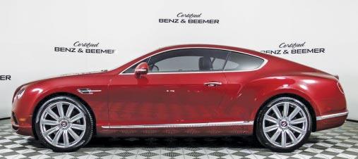 2017 Bentley Continental GT V8- Dragon red metallic over beluga leather, twin-turbo 4.0 liter V8, automatic trans, 14,018 miles, AWD, Mulliner driving specifications, contrast interior stitching, burr walnut extended interior trim, 3-spoke sport wood & hide trimmed steering wheel, parking assist w/ camera. $125,000 Stock #P20021 Certified Benz & Beemer (844) 568-1362
