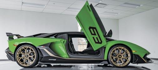 2022 Lamborghini Aventador LP 780-4 Ultimae Roadster- Verde Turbine over Nero Cosmus/Bianco Polar leather/ alcantara, 159 miles, 20" 10-spoke gloss black alloy wheels, lots of interior & exterior carbon fiber, gold colored calipers, crest embroidered to headrests in gold. $1,199,900 Stock #CS459 O’Gara Coach Beverly Hills (877) 588-8862