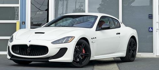 Maserati GranTurismo MC- Bianco eldorado over red leather, 454 hp 4.7 liter V8, 6-speed auto trans, 18,930 miles, tridents embroidered to headrests, carbon fiber interior trim, Scuderia style rear exhaust, alcantara headliner, black exterior trim, red calipers, black premium alloy wheels. $74,800 Copley West (949) 836-8844