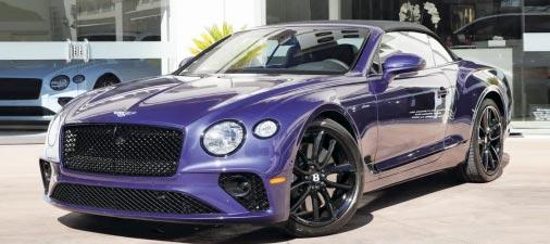 2023 Bentley GTC Azure Convertible- Tanzanite purple metallic over Damson/ Beluga leather, 4.0 liter V8, 2,146 miles, Continental Blackline specification, Mulliner contrast gear lever & steering wheel spokes, Naim for Bentley, Bentley rotating display, Bentley self leveling wheel badge, Cotes de Geneve console inserts, heated steering wheel. $279,988 Stock #D23B3593 O’Gara Coach Beverly Hills (310) 659-4050
