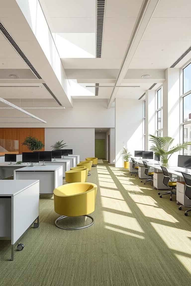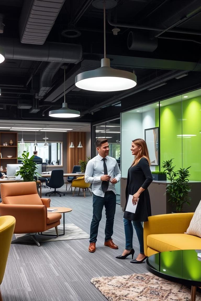 Coffee tables and accent pieces complement the workspace décor, adding a touch of elegance and functionality.
