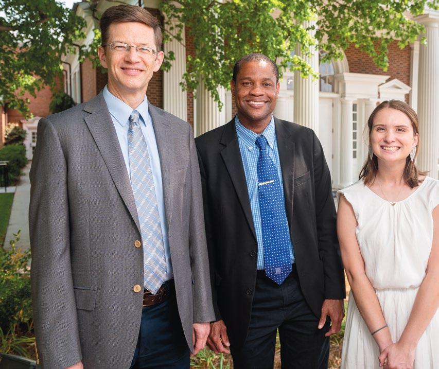 HPU President Nido Qubein, left, and Dan Hauser, vice president and director of athletics, right, are pictured with the Big South Conference Sasser Cup trophy.