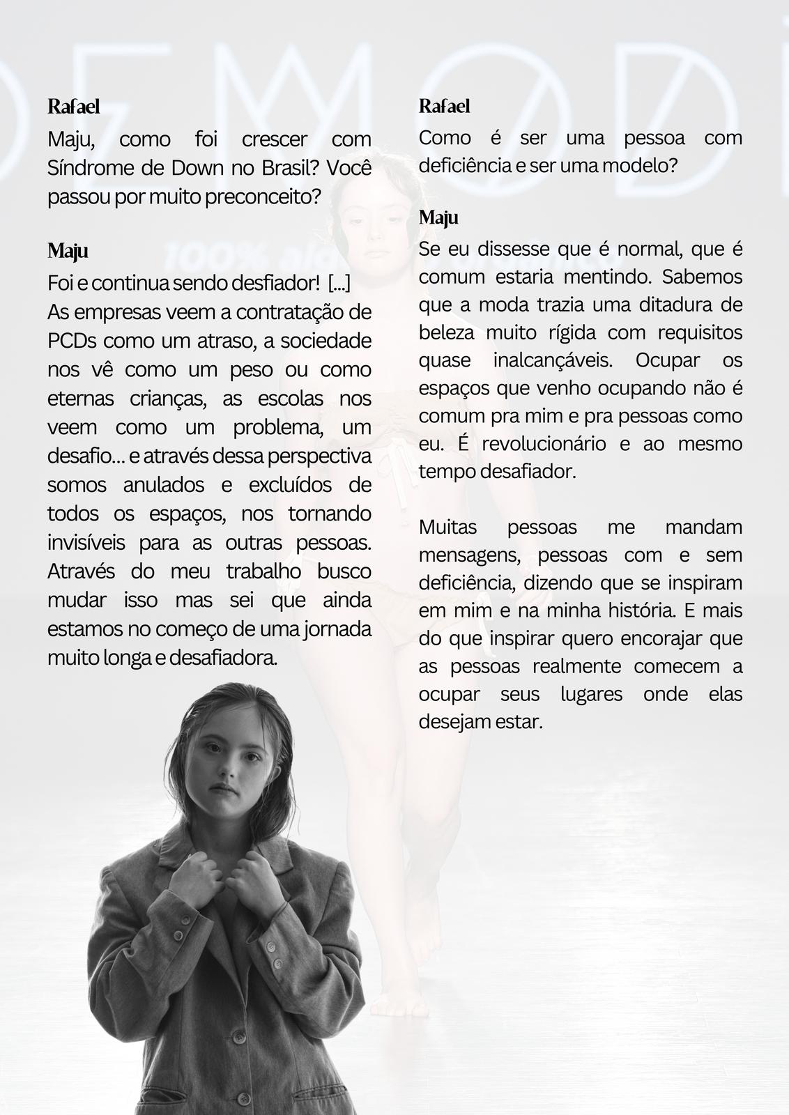 A nossa estrela da capa esse mês é a Maju, No auge dos seus 19 anos, Maria Julia de Araújo, ou simplesmente Maju, realizou o sonho de uma vida inteira: desfilar no São Paulo Fashion Week. A modelo carioca, portadora da síndrome de Down, estreou no evento nessa quarta-feira, cruzando a passarela para o Projeto Ponto Firme, do estilista Gustavo Silvestre