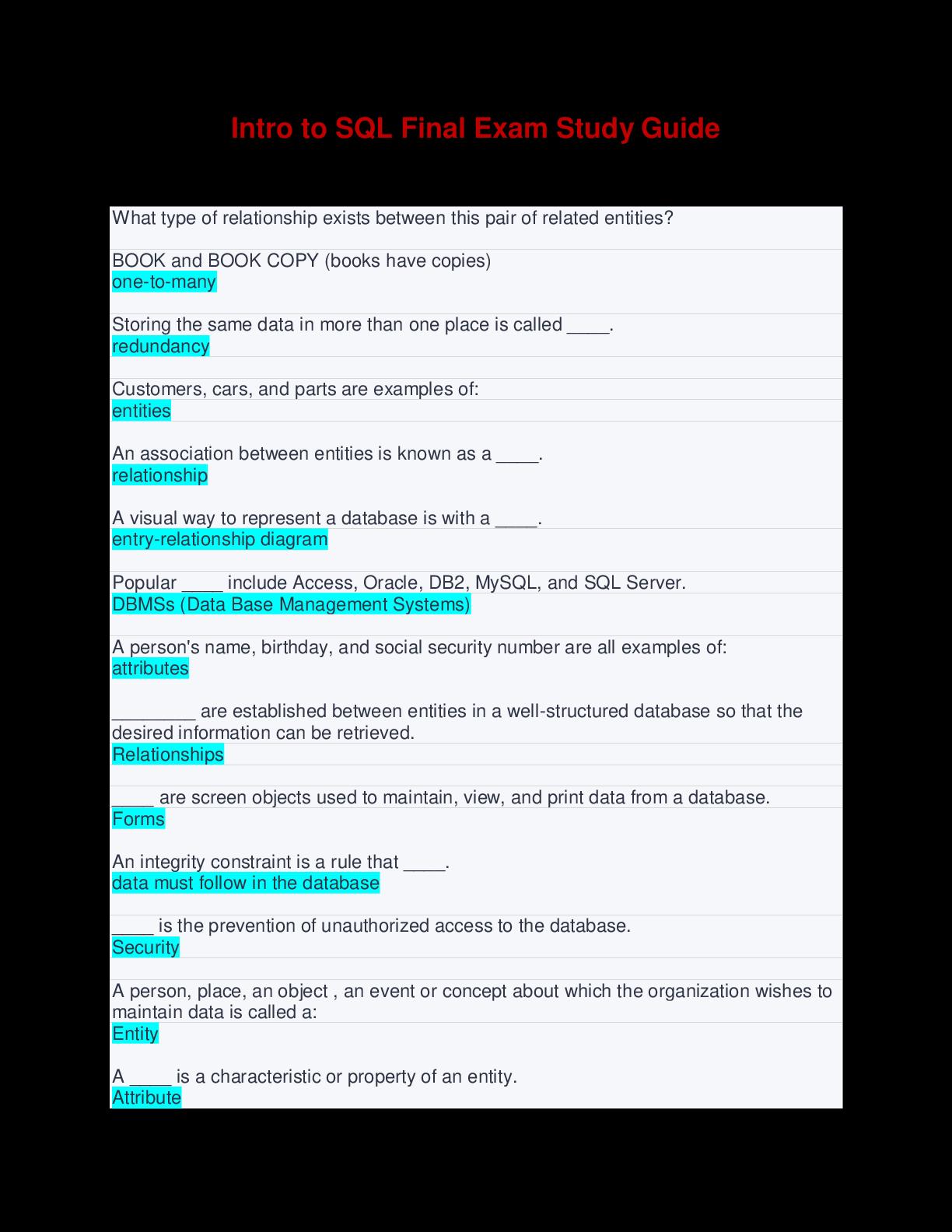 CLICK LINK BELOW TO ACCESS THIS DOCUMENThttps://scholarfriends.com/singlePaper/246735/intro-to-sql-final-exam-study-guide