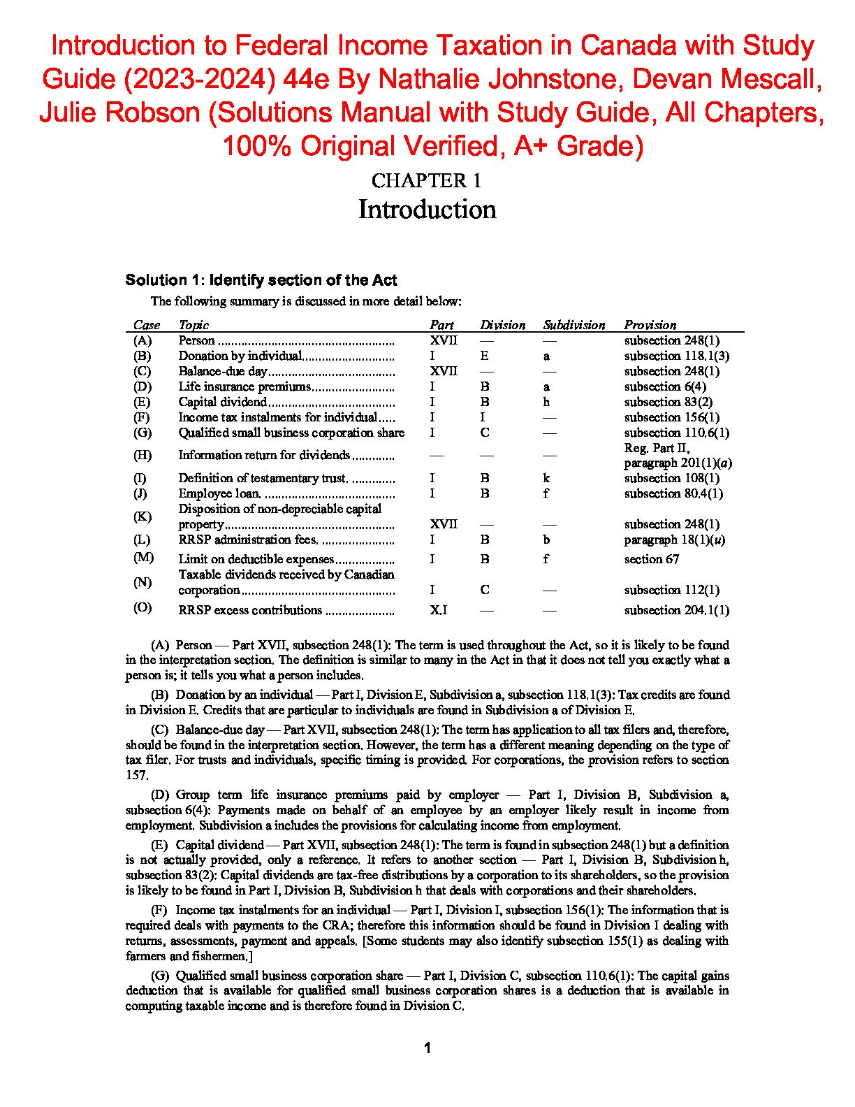 Introduction to Federal Income Taxation in Canada with Study Guide 2023I2024 44th Edition By Nathalie Johnstone, Devan Mescall, Julie Robson (Solutions Manual with Study Guide, All Chapters, 100% Original Verified, A+ Grade)
