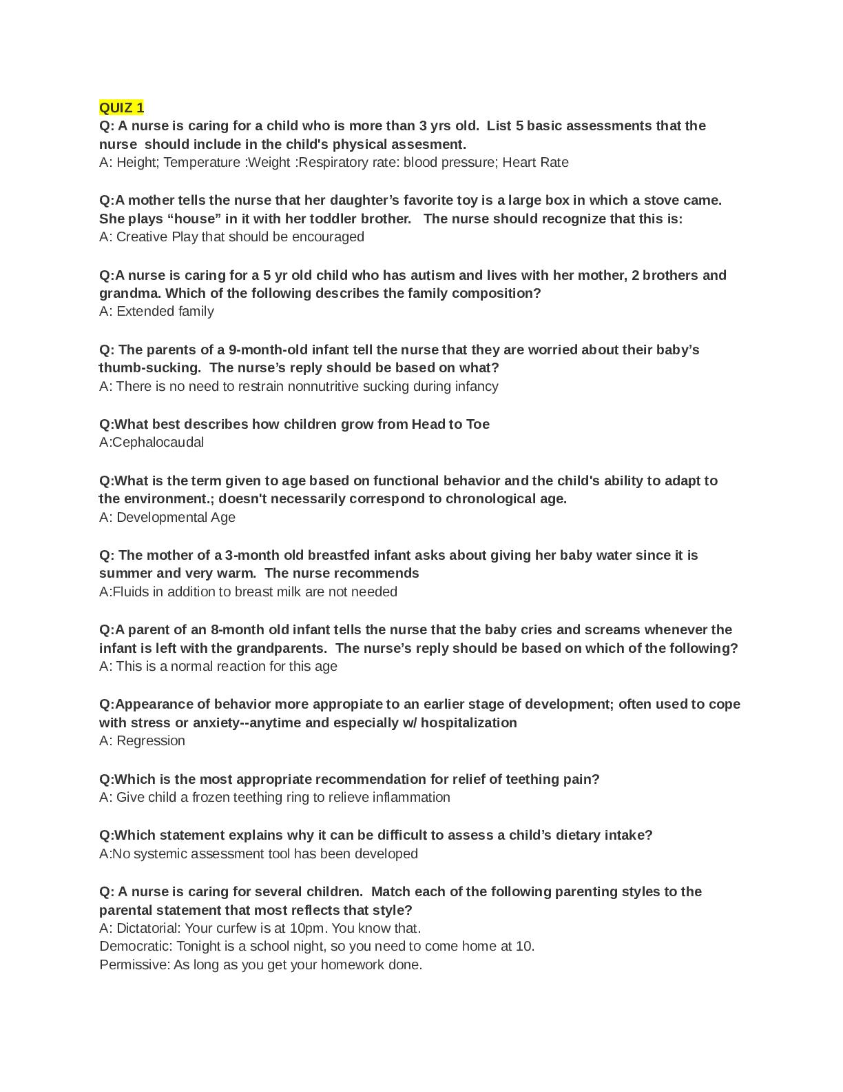 NURS 126A, San Jose University PEDS Quiz Questions