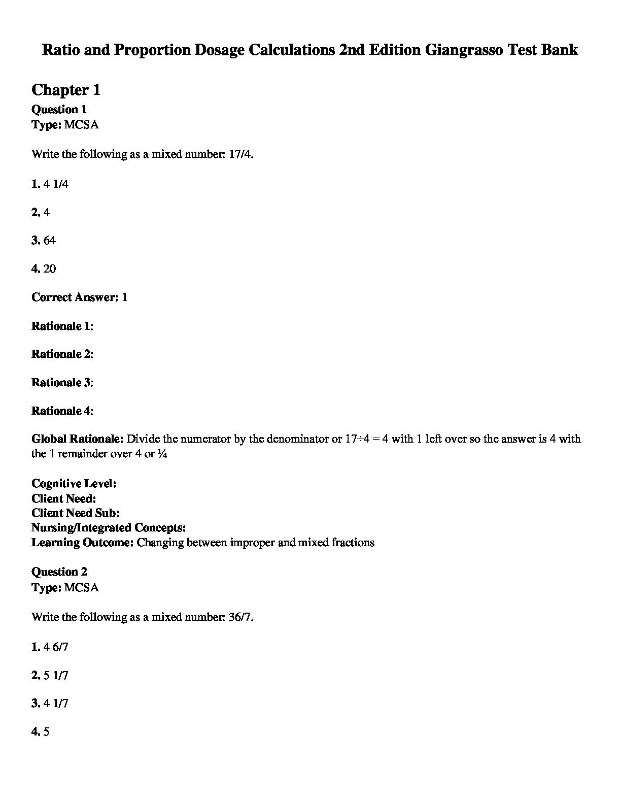 Ratio and Proportion Dosage Calculations 2nd Edition Giangrasso Test Bank