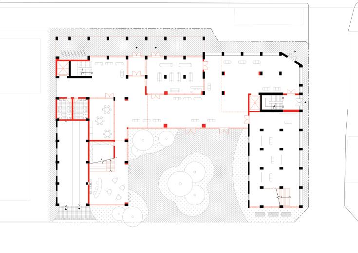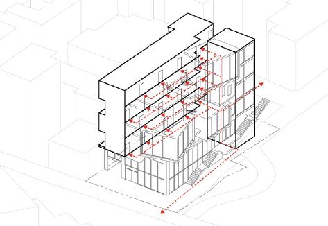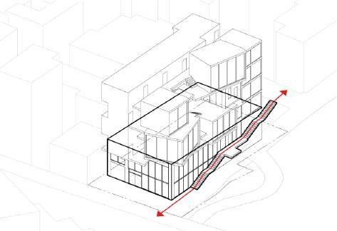 풍부하게�위치해�있어�북쪽으로�좋은�뷰를�가지며�광희동의�얼굴과�같은�기능을�하는�곳이다. 옹벽과�인접�주거지역 남측에는�맞벽�컨디션이�필연적으로�발생하고�북측에는�경사도로가�위치해�있어�저층부에는 주거보다�지역�공공성을�가진�프로그램이�위치하는�것이�타당하였다. 또한�남측�인접�건물들의