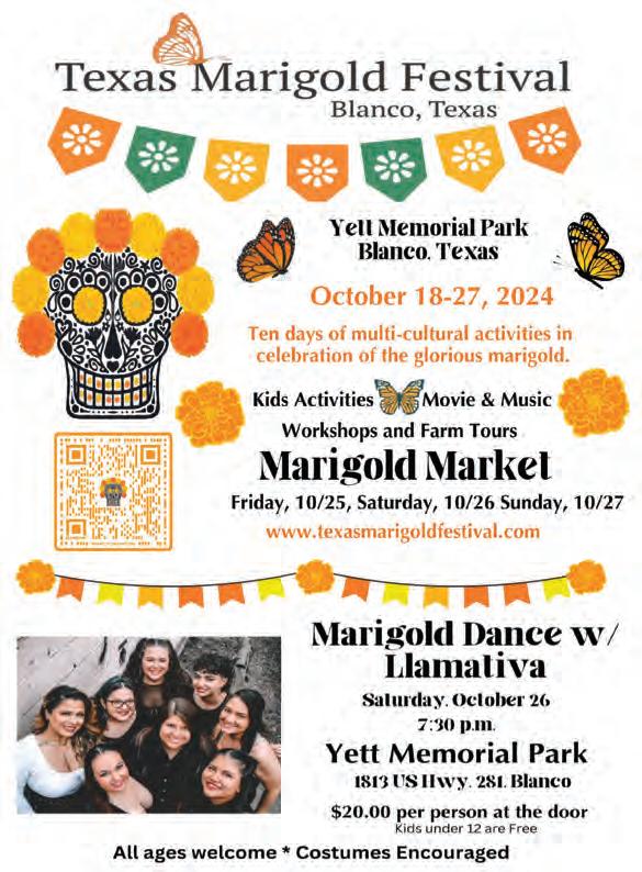 BLANCO H Celebrate the many cultures of Texas and the beautiful flower that is at the center of the season’s celebrations during the 4th Annual Texas Marigold Festival, with activities planned October 18-27. The hometown festival will get you in the spirit of the season! Movies, music, vendors market, and lots of fun things for the kids to do. Take in a workshop or just stroll the Marigold Market October 25-27.