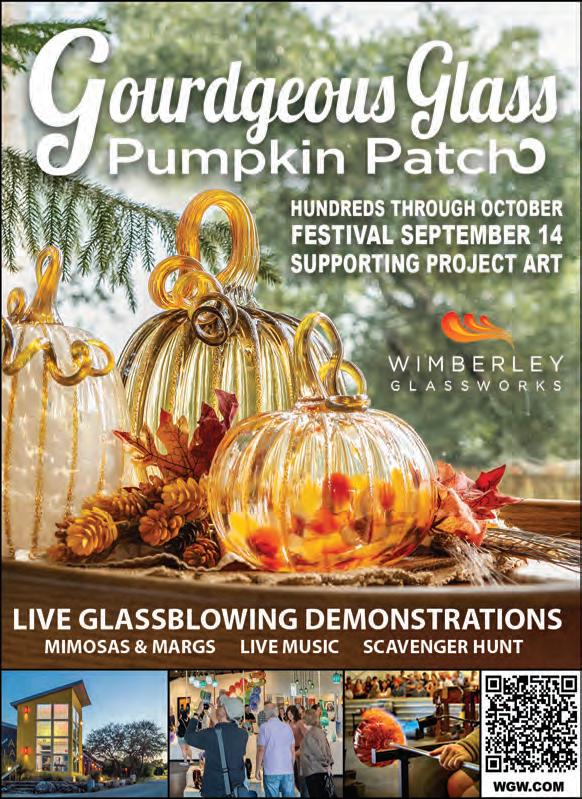 WIMBERLEY H Get ready for a fall festival like no other! Join Wimberley Glassworks September 14 from 10 am to 2:30 pm for the Gourdgeous Glass Pumpkin Patch. Explore hundreds of stunning glass pumpkins, enjoy live glassblowing demonstrations, take part in exciting scavenger hunts, and groove to live music by local Wimberley artist Anthony Wright on the guitar. And don’t forget to cool off with some ice-cold margaritas.