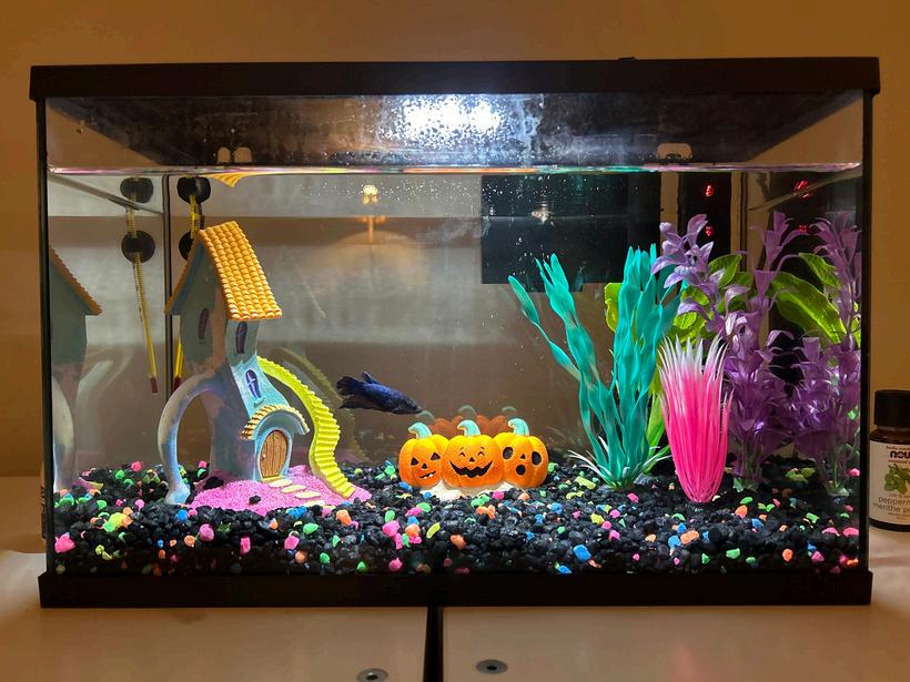 I have a pet betta fish named Bluey. Bluey is the best. He has a very cool fish tank and loves hiding in the plants. Each month, Bluey has a special ornament that we keep in the middle of the tank to celebrate an upcoming holiday/season. For example, in October, he will have 3 scary pumpkins in his tank!