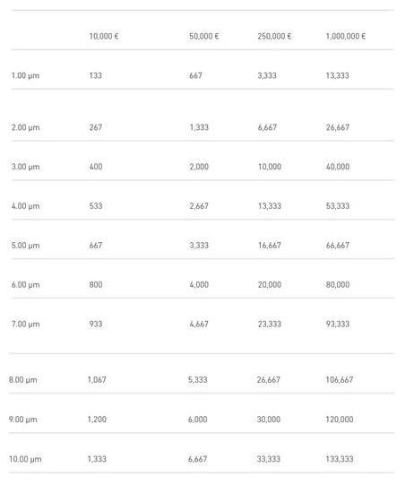 The table to the left reflects the cost savings based on a customer baseline of approx.75 µm. Increments of 1 µm used to demonstrate savings at the smallest measurable level.