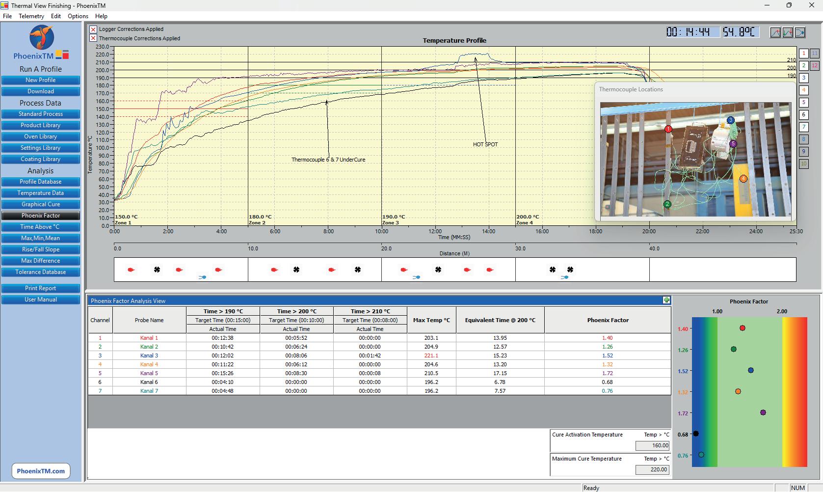 A critical component of the PhoenixTM Finishing system is the Thermal View Finishing software. Designed specifically for the needs of the coating market it allows not only the set-up/download of logger but the raw process data to be converted into meaningful information. Such information can be used to understand exactly how the process is operating, allow informed changes and provide certified evidence to prove to others the quality you are providing.