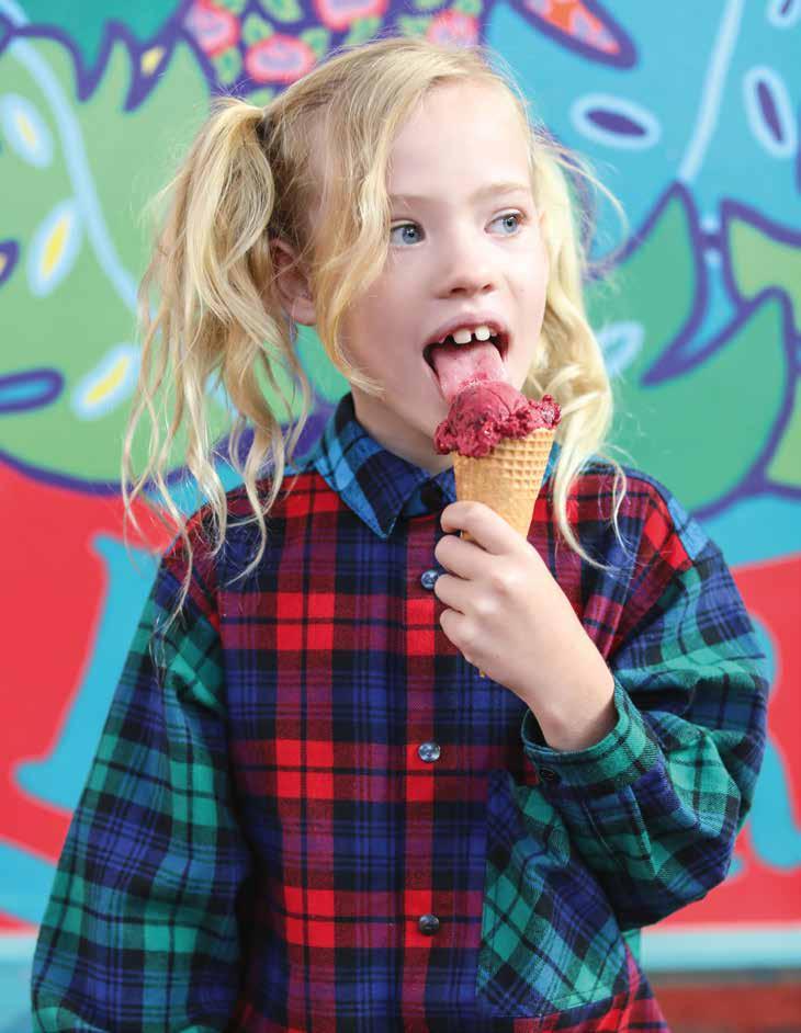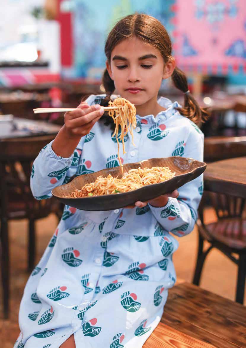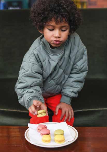 Lasst es euch schmecken! So ist diese Ausga be betitelt und das bezieht sich nicht nur auf die Titelgeschichte, in der unsere Autorin Eva Maria Schneider über einen gesunden, gelasse nen Umgang mit Kindern und ihren Essensvor lieben schreibt. Für das Shooting sind wir mit Fotografin Emily Kornya und sechs Kindern in die Arminiusmarkthalle gefahren, in der sie sich aus dem reichhaltigen internationalen Speise angebot aussuchen konnten, was sie wollten. Und so landeten Sandwich, Schnitzel, Asianu deln, Eis, Burger, Pommes und Macarons in den Kinderbäuchen. Nicht gerade das, was man sich unter gesund vorstellt. Allerdings plädieren auch Expert:innen dafür, dass Genuss am Essen, ein abwechslungsreiches Speisenangebot und eine