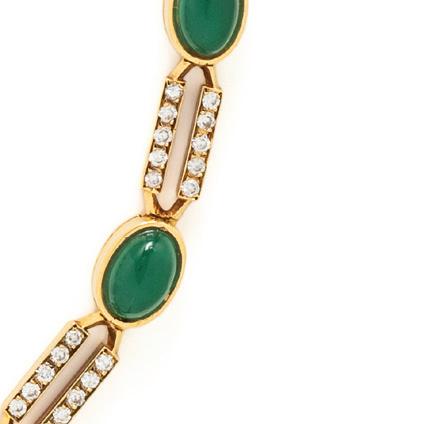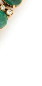 Containing round brilliant cut diamonds and cabochon emerald eyes, hinged at the back. 18 karat yellow gold and platinum. 6 1/4 inches inner circumference.