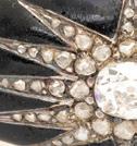 Containing a center rose cut diamond measuring approximately 10.35 x 9.75 mm surrounded by round and pear shaped rose cut diamonds and enamel detail. Mounted in silver-topped gold. 2 1/8 x 1 7/8 inches.