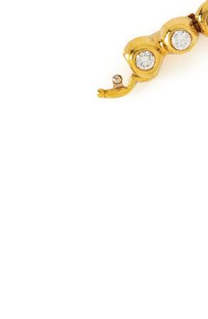 Containing round brilliant cut diamonds and cabochon ruby eyes, hinged at back. 18 karat yellow gold and platinum. 6 1/4 inches inner circumference.