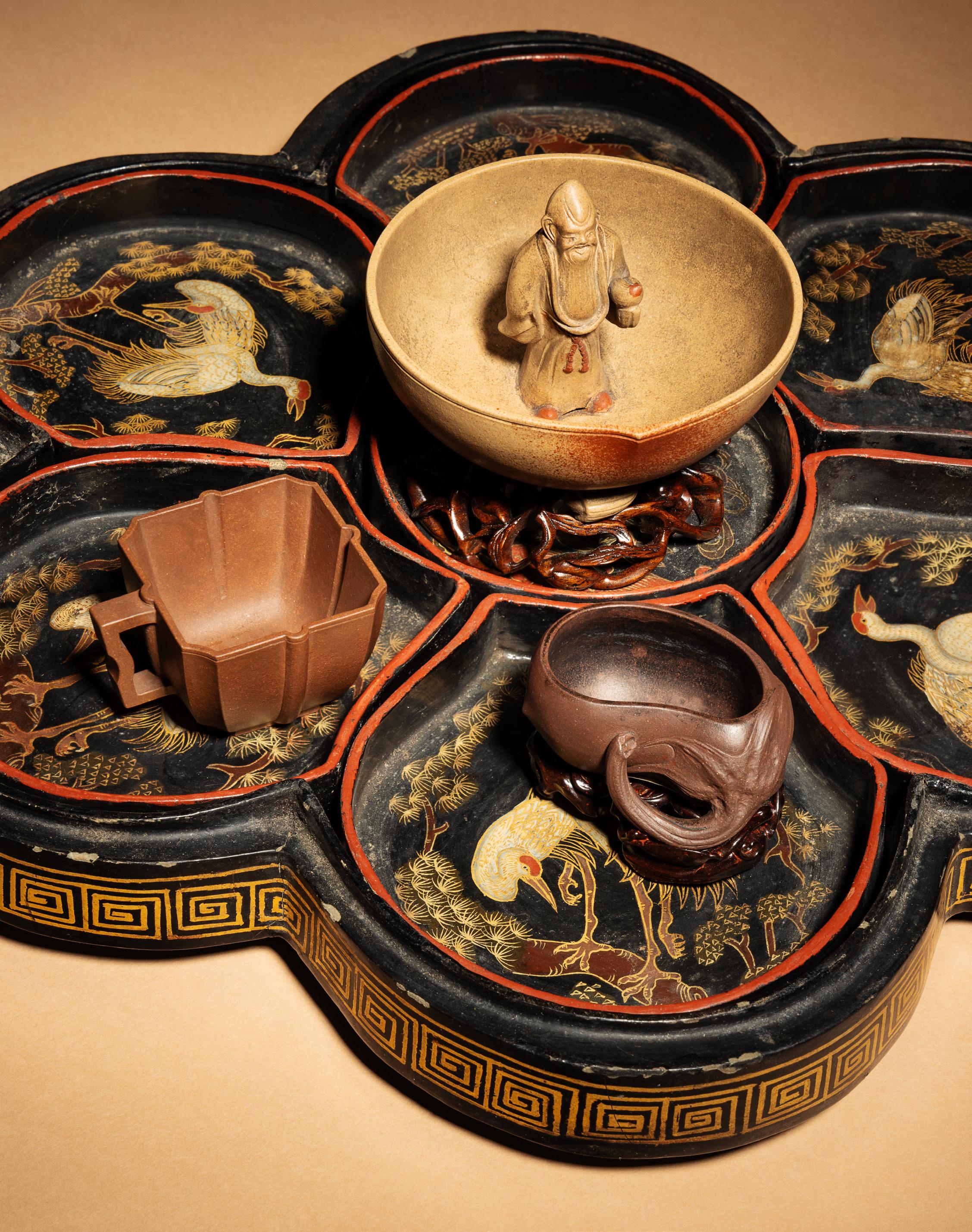 Our March 21st Asian Art auction, held during Asia Week in New York City, included many notable works from private and institutional collections. Highlights included three rare Chinese Yixing coupes bearing seals of the celebrated 17th/18th century artisan Chen Mingyuan, acquired by Mr. Jay Butterman from his friends (and clients), Edith and Joel Frankel, well-known dealers of Chinese works of art. Comprising a rare “puzzle cup” depicting Shoulao in a peach, a delicate “Eggplant” coupe with inscribed dedication, and an elegant facetted small wine cup, these pieces came to Freeman’s | Hindman after the highly successful sale of two related Yixing coupes from the Estate of Betty Eisler, sold in our September 2024 Asia Week auction. All five of these pieces were formerly in the extraordinary collection of Yixing wares assembled by Shanghai connoisseur Pang Yuanji (1864-1947). Pang, with the artist Lu Hui (1851-1920), compiled a very rare twovolume set of rubbings and descriptions, probably between 1910-1920, recording these scholar’s objects in Pang’s collection.