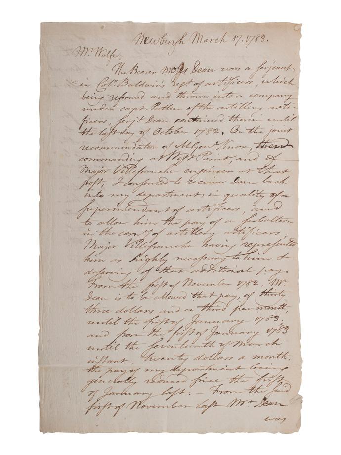 PICKERING, Timothy (1745-1829). Autograph letter signed (“T. Pickering QMG”) as Quartermaster General of the Continental Army. Newburgh, 17 March 1783.