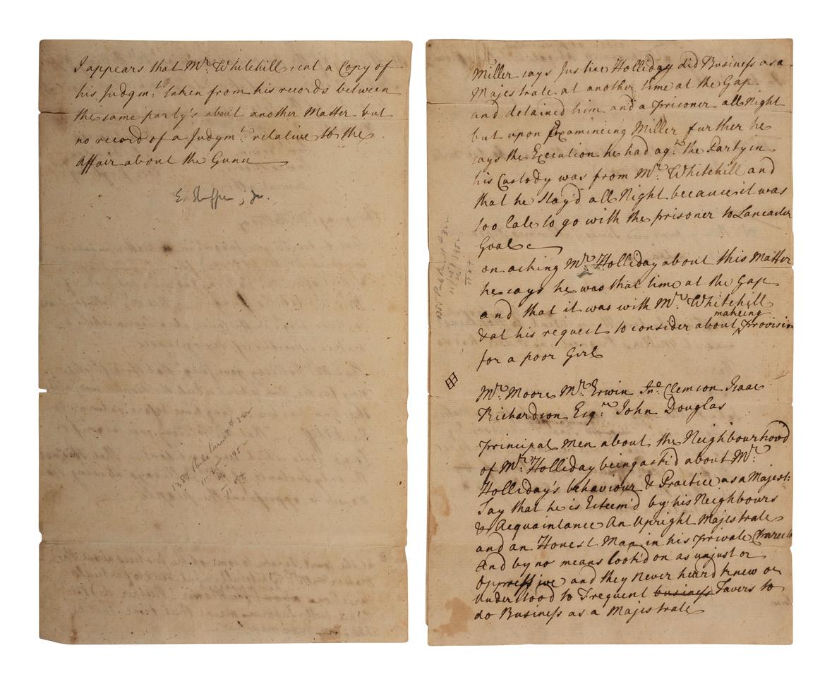 4 pages, 4to, addressed on integral leaf, docketed “THE ‘GREATEST MAN IN AMERICA’ WILL BE AT PHILADELPHIA IN MAY” Washington’s trusted advisor, Timothy Pickering, arranges for Washington’s arrival in Philadelphia. “The ‘Greatest Man in America’ will be at Philadelphia in May, and I dare say will not forget the barge. Pray therefore endeavour to send it to Alexandria by the first [?] capable of carrying it, which is bound thither. I mentioned Capt. Henry White, my townsman, I request is at a favor from him.” Pickering also inquires about the cost of iron, mentions that he has lent his own barge to Baron Steuben, and attempts to arrange for returns for his horses.